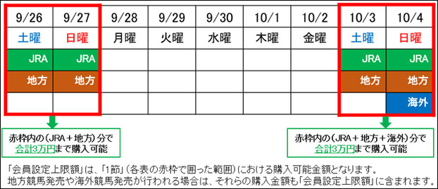 会員ご本人が、JRAの電話・インターネット投票において「一節」(注記1)に購入できる上限額を100円単位で設定することができます。