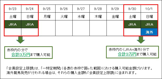 会員ご本人が、JRAのUMACA投票において「一特定期間」(注記1)に購入できる上限額を100円単位で設定することができます。