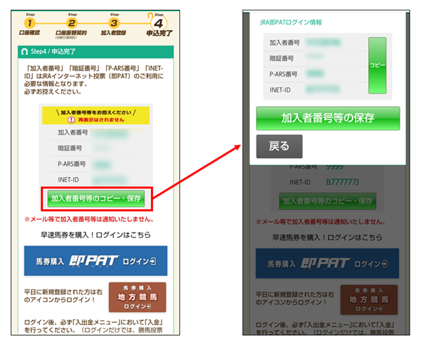 即PAT・JRAダイレクトの新規登録時の「申込完了」画面に表示された加入者番号・P-ARS番号・INET-IDを、保存・コピーする機能を追加します。これにより、ログインに必要な情報を、端末のメモ機能やメールアプリ等に簡単に保存することができます。