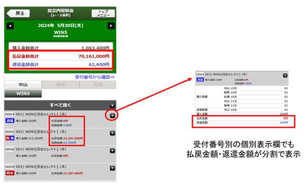 過去の投票内容履歴において、返還が発生した組み合わせがある場合、これまでは「払戻/返還金額」として合算した金額が表示されていましたが、払戻金と返還金を分割してそれぞれ表示するよう変更いたします。