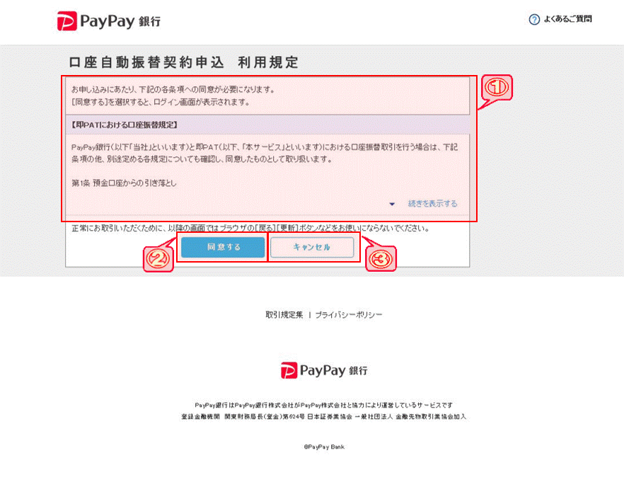 即PATご利用のためには、お客様とPayPay銀行との間で口座自動振替契約の手続が必要となります。この画面では、口座振替の規定を表示しますので、内容をご確認下さい。