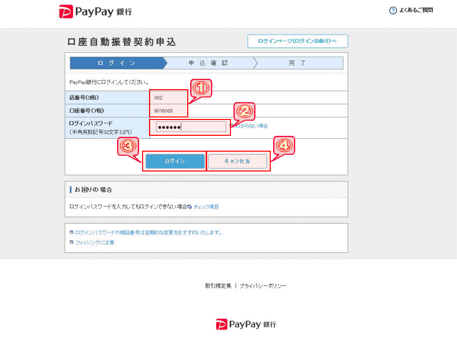 この画面では、口座自動振替契約手続のために、PayPay銀行にログインします。ログインパスワードを入力してログインして下さい。
