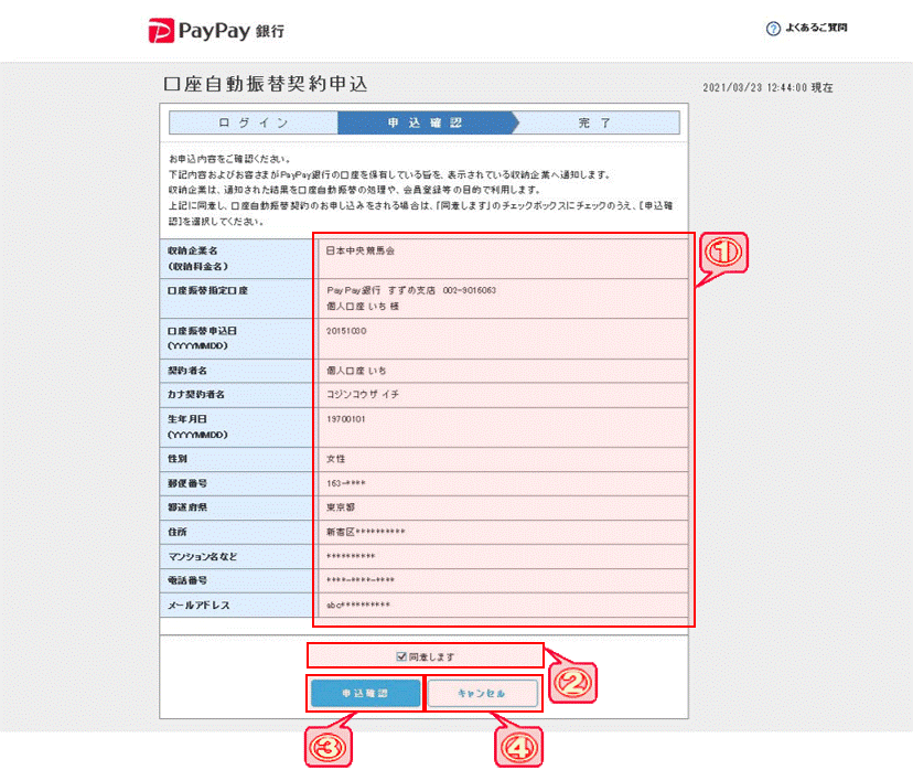 自動口座振替契約の申込みを行います。「同意します」欄にチェックを入れて申込みを行うと、口座自動振替契約の手続が完了します。