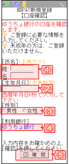 この画面では、お客様の銀行口座を確認するための口座情報を入力していただきます。入力していただいた情報は、ゆうちょ銀行に照会して確認します。
