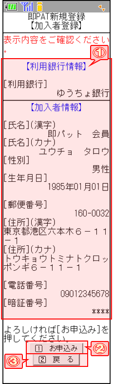 この画面では、前の画面で入力していただいた情報を表示しますので、内容をご確認ください。「お申込み」ボタンを押すと、即PATへの登録が完了します。 |