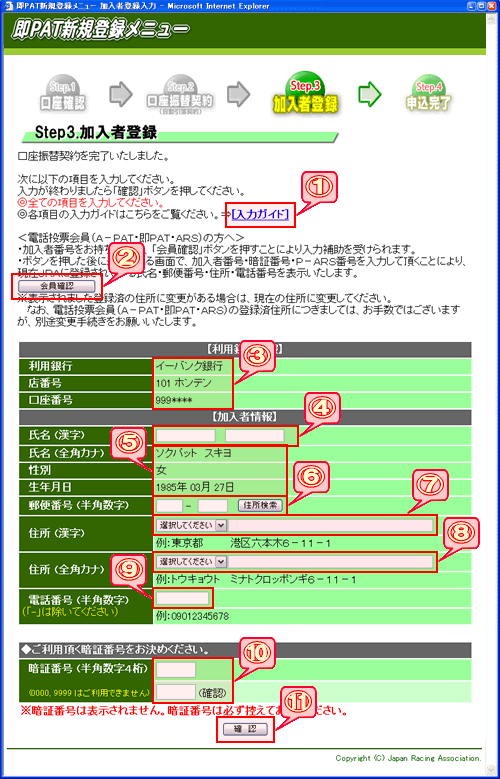 この画面では、即PATへの新規登録にあたり必要な情報を入力していただきます。すべての項目を入力して下さい。 |