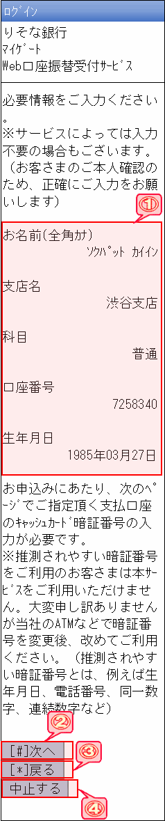 ログイン開始画面で「口座情報入力へ」ボタンを押した場合に表示される画面です。