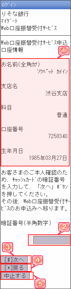 ログイン開始画面で「口座情報入力へ」ボタンを押した場合に表示される画面です。