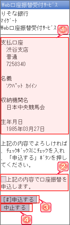 この画面では、 口座振替契約の申込みを行います。お申込内容とご本人情報をご確認いただき、申込みを行うと、口座振替契約の手続が完了します。