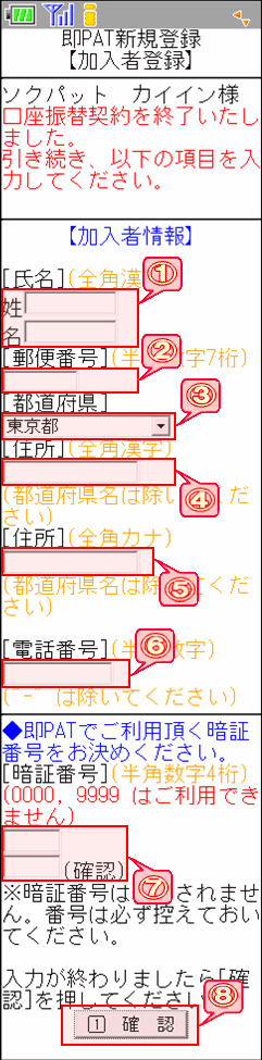 この画面では、即PATへの新規登録にあたり必要な情報を入力していただきます。すべての項目を入力してください。 |