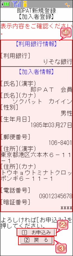 この画面では、前の画面で入力していただいた情報を表示しますので、内容をご確認ください。「お申込み」ボタンを押すと、即PATへの登録が完了します。 |