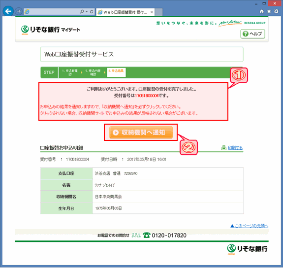 口座振替契約の受付番号が表示されます。内容をご確認下さい。