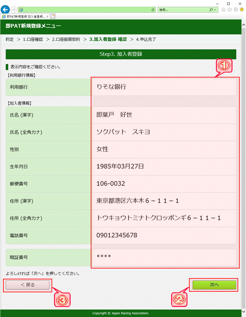入力内容 前の画面で入力していただいた情報を表示します。 なお、暗証番号については「****」で表示します。 「次へ」ボタン このボタンを押すと、表示されている内容で、即PAT会員として登録を行います。申込完了画面が表示されれば、登録完了です。 「戻る」ボタン 表示されている内容に間違いなどがある場合は、このボタンを押して、入力画面に戻ってください。