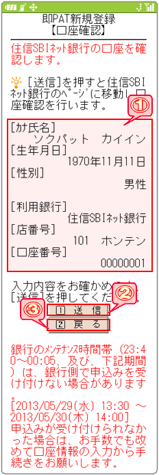 表示内容を口座確認のために住信SBIネット銀行に送信します。