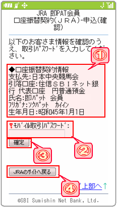 口座認証を中止する場合は、「JRAのサイトへ戻る」ボタンを押してください。