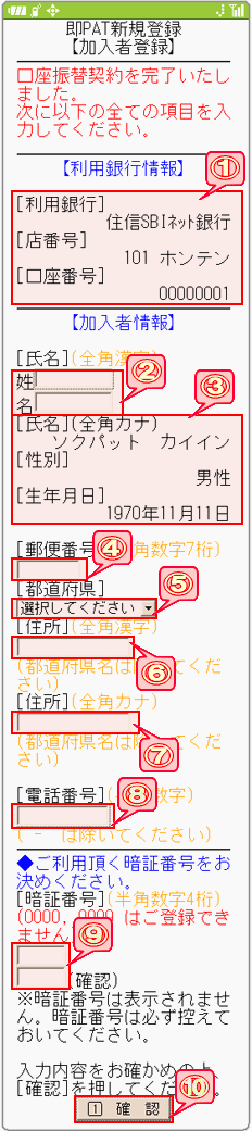 この画面では、即PATへの新規登録にあたり必要な情報を入力していただきます。すべての項目を入力してください。 |