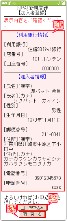 この画面では、前の画面で入力していただいた情報を表示しますので、内容をご確認ください。「お申込み」ボタンを押すと、即PATへの登録が完了します。 |