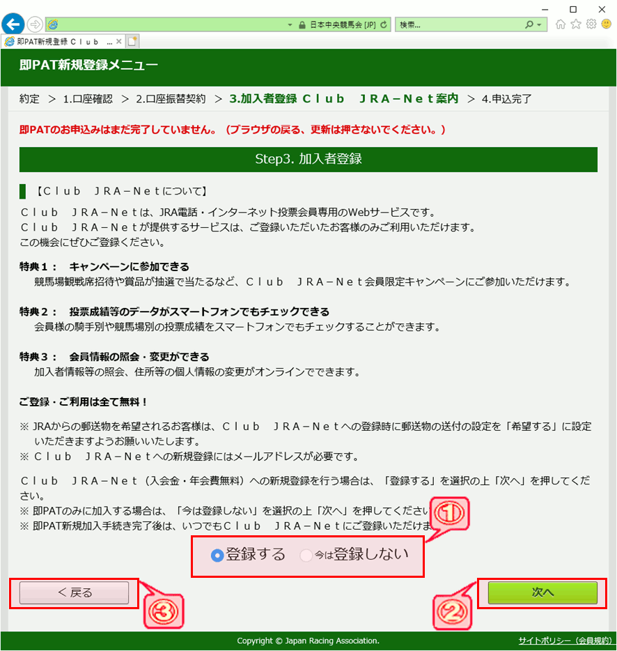 即PATへの加入と併せてClub JRA-Netへ登録を希望される方は「登録する」を選択してください。