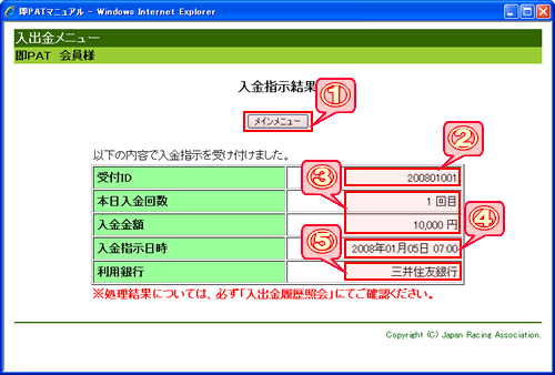 「メインメニュー」ボタン 入出金メインメニューに戻ります。 受付ID 受け付けた入金処理の固有番号です。 入力・表示内容 前の画面で入力していただいた内容、および表示した内容です。 入金指示日時 入金指示を受け付けた日時です。 利用銀行 お客様がご利用の銀行(三井住友銀行)を表示します。