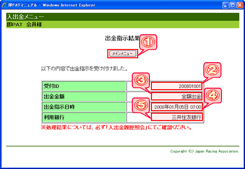 「メインメニュー」ボタン 入出金メインメニューに戻ります。 受付ID 今回の出金処理の固有番号です。 出金金額 「全額出金」を表示します。 出金指示日時 出金指示を受け付けた日時です。 ※お客様の口座に振り込まれた日時ではありませんのでご注意下さい。 利用銀行 お客様がご利用の銀行(三井住友銀行)を表示します。