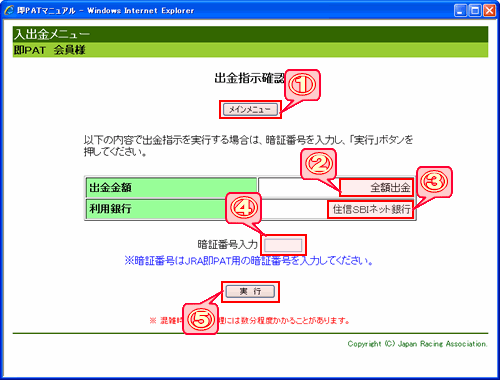 「メインメニュー」ボタン 入出金メインメニューに戻ります。 出金金額 「全額出金」を表示します。開催途中での出金は、すべて「全額出金」となります。 利用銀行 お客様がご利用の銀行(住信SBIネット銀行)を表示します。 暗証番号入力 JRA即PAT用の暗証番号を入力します。 「実行」ボタン 表示の内容で出金処理を実行します。