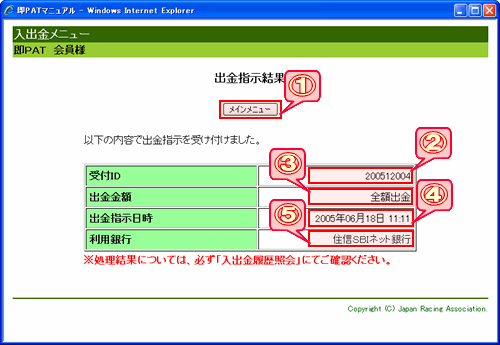 「メインメニュー」ボタン 入出金メインメニューに戻ります。 受付ID 今回の出金処理の固有番号です。 出金金額 「全額出金」を表示します。 出金指示日時 出金指示を受け付けた日時です。 ※お客様の口座に振り込まれた日時ではありませんのでご注意下さい。 利用銀行 お客様がご利用の銀行(住信SBIネット銀行)を表示します。
