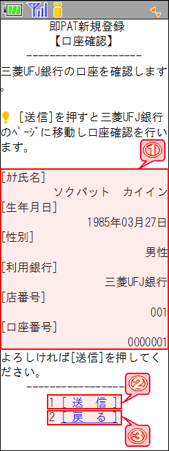 表示内容を口座確認のために三菱UFJ銀行に送信します。