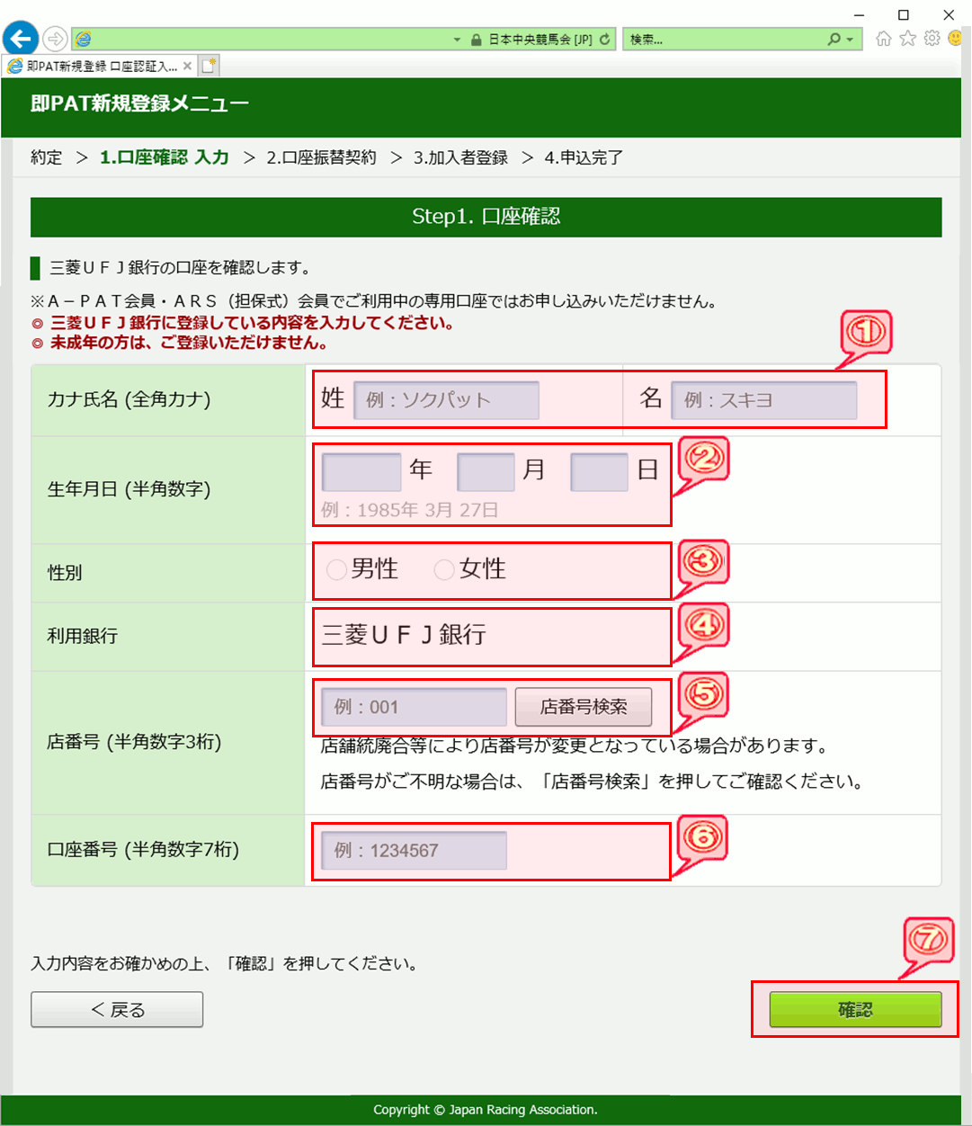 この画面では、お客様の銀行口座を確認するための口座情報を入力していただきます。入力していただいた情報は、三菱UFJ銀行に照会して確認します。