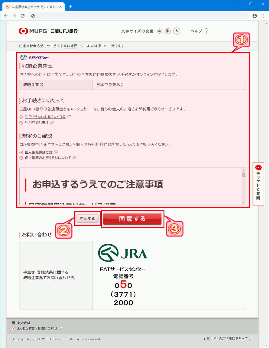 即PATご利用ににおける口座振替申込受付サービスに関する確認事項です。内容をご確認ください。