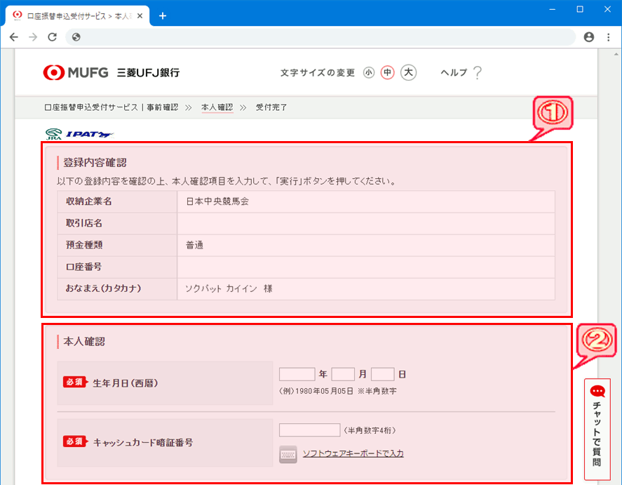 三菱UFJ銀行に登録されているご自身の生年月日(西暦4桁、月、日は2桁)、キャッシュカードの暗証番号を入力してください。