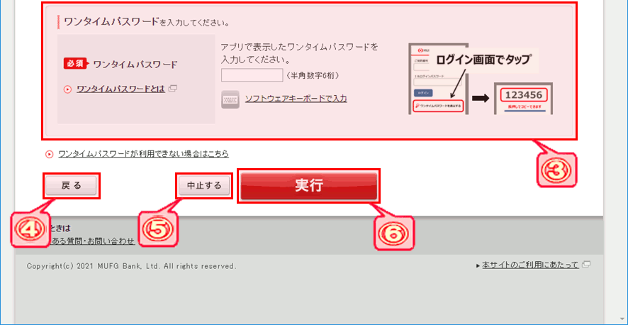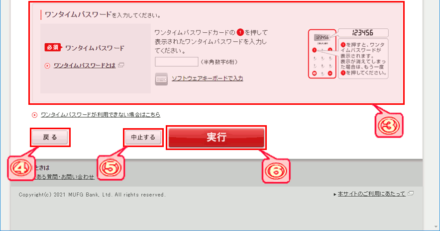 スマートフォンアプリ、またはワンタイムパスワードカードで表示したワンタイムパスワード(数字6桁)を入力してください。