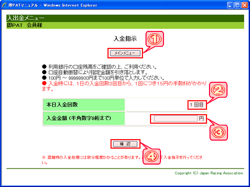 「メインメニュー」ボタン 入出金メインメニューに戻ります。 本日入金回数 今回実行する入金回数です。 入金金額 お客様の銀行口座からJRAへ移動する資金の金額を入力します。 「確認」ボタン 即PATのメインメニューを閉じる場合は、このボタンをクリックしてください。