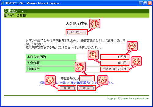 「メインメニュー」ボタン 入出金メインメニューに戻ります。 本日入金回数 本日の入金処理実行回数です。今回処理する分を含めた回数が表示されます。 入金金額 お客様が指定された入金金額です。 利用銀行 お客様がご利用の銀行(三菱東京UFJ銀行)を表示します。 暗証番号入力 JRA即PAT用の暗証番号を入力します。 「実行」ボタン 表記の内容で、入金処理を実行します。 「戻る」ボタン 前の入力画面に戻ります。