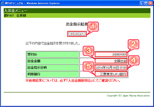 「メインメニュー」ボタン 入出金メインメニューに戻ります。 受付ID 今回の出金処理の固有番号です。 出金金額 「全額出金」を表示します。 出金指示日時 出金指示を受け付けた日時です。 ※お客様の口座に振り込まれた日時ではありませんのでご注意ください。 利用銀行 お客様がご利用の銀行(三菱東京UFJ銀行)を表示します。