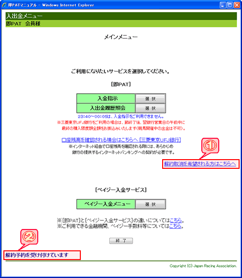 即PATの解約予約を取り消す場合は、入出金メインメニュー画面の左下に