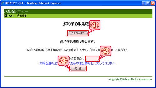 この画面では、即PATの解約予約取消手続を実行します。暗証番号を入力して「実行」ボタンをクリックすると、解約予約取消の受付が完了します。