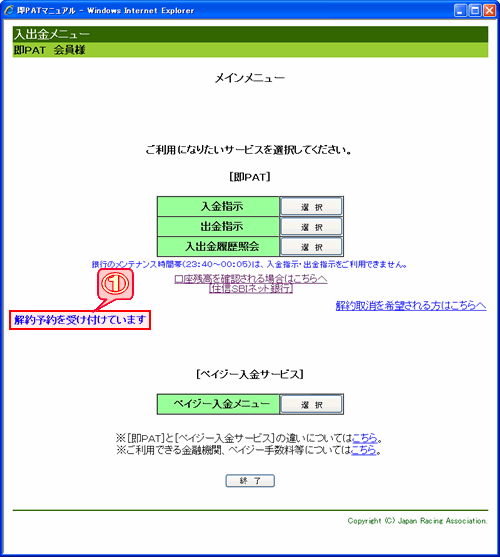 即PATの解約予約の受付手続が完了すると、入出金メインメニューの画面左下に、「解約予約を受け付けています」のメッセージが表示されます。