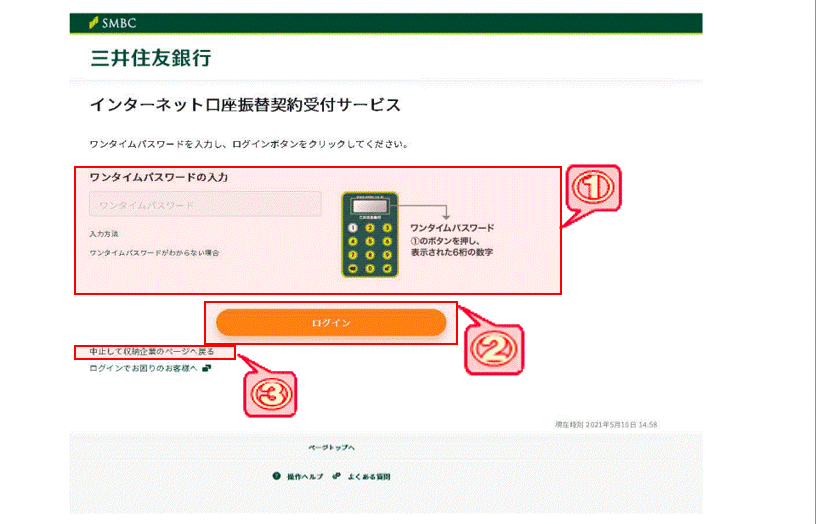 この画面では、三井住友銀行の口座を確認するために、三井住友銀行のサイトにログインします。ワンタイムパスワード(数字6桁)を入力してログインボタンを押して下さい。口座確認が実施されます。