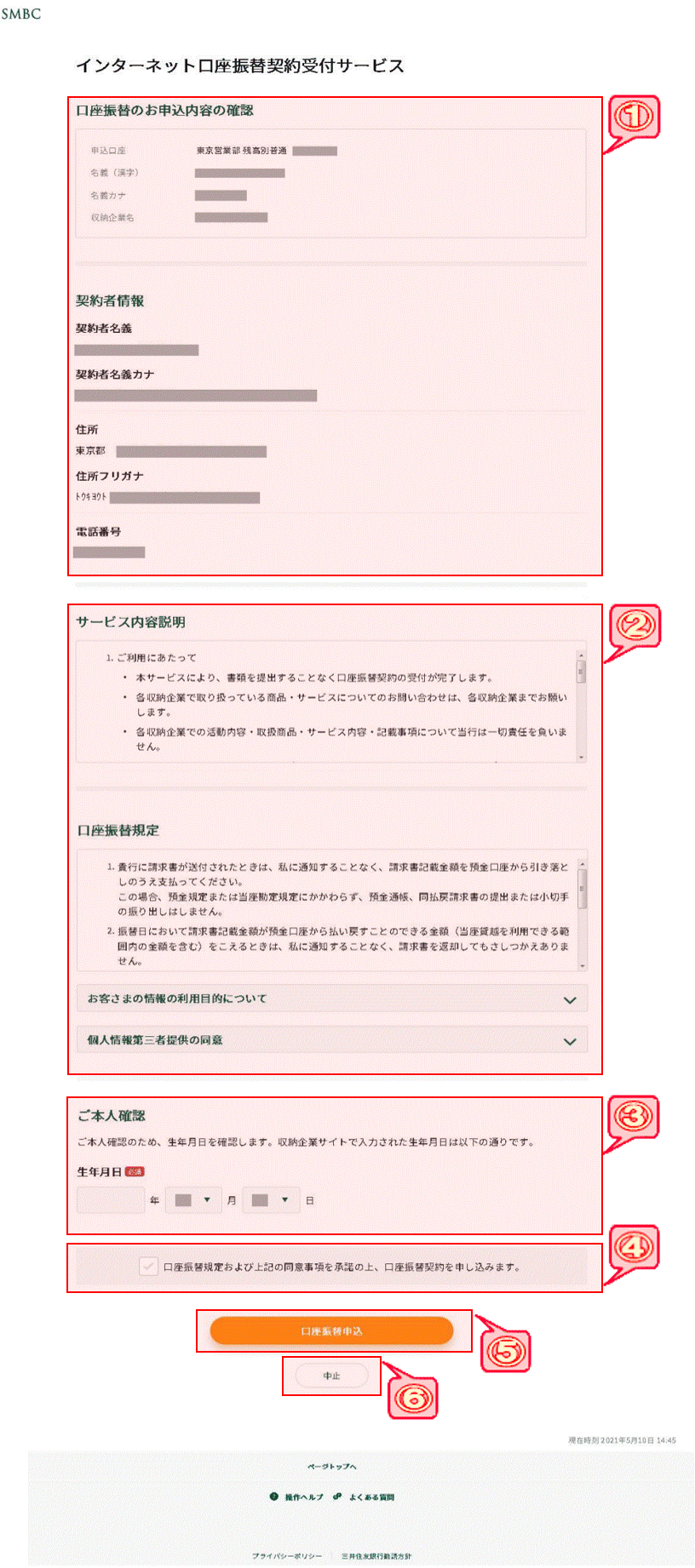即PATご利用のためには、お客様と三井住友銀行との間で口座振替契約の手続が必要となります。この画面では、口座振替のサービス内容を表示します。