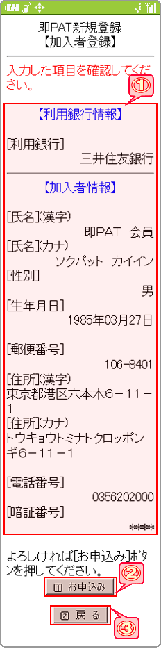 この画面では、前の画面で入力していただいた情報を表示しますので、内容をご確認下さい。「お申込み」ボタンを押すと、即PATへの登録が完了します。