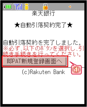 「即PAT新規登録画面へ」 自動引落契約手続きを終え、即PAT新規登録手続に戻る場合は「即PAT新規登録画面へ」を押して下さい。即PATの新規登録手続画面に戻ります。 ※「即PAT新規登録画面へ」を押さないと、正しく登録手続きが行えない場合がありますのでご注意下さい。