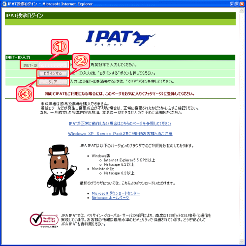 INET-ID INET-IDを入力します。 「INET-ID」は、即PATの登録時に発行された、英数字8文字の認証コードです。 「ログイン」ボタン INET-IDを入力していただいた後に押すと、IPAT投票メインメニューに遷移します。 「クリア」ボタン 入力したINET-IDを消去します。