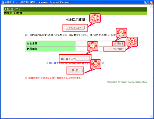 「メインメニュー」ボタン 入出金メインメニューに戻ります。 出金金額 「全額出金」を表示します。開催途中での出金は、すべて「全額出金」となります。 利用銀行 お客様がご利用の銀行(イーバンク銀行)を表示します。 暗証番号入力 JRA即PAT用の暗証番号を入力します。 「実行」ボタン 表示の内容で出金処理を実行します。