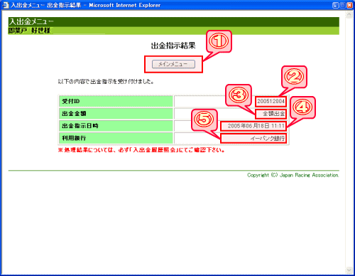 「メインメニュー」ボタン 入出金メインメニューに戻ります。 受付ID 今回の出金処理の固有番号です。 出金金額 「全額出金」を表示します。 出金指示日時 出金指示を受け付けた日時です。 ※お客様の口座に振り込まれた日時ではありませんのでご注意下さい。 利用銀行 お客様がご利用の銀行(イーバンク銀行)を表示します。