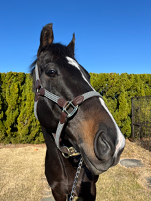 こんにちは、ロンゴノットです。スリムな馬体と黒く光って綺麗な青毛が自慢です。