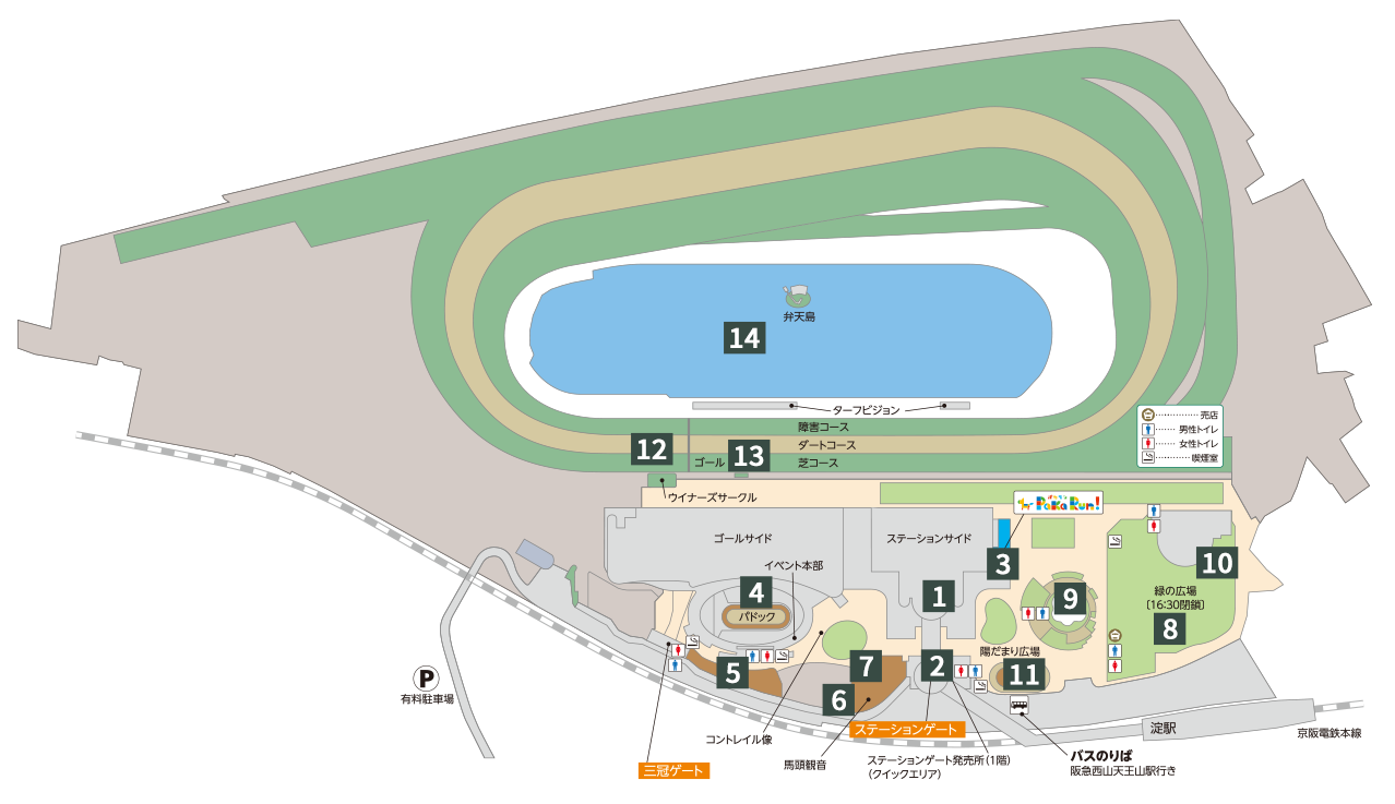 スタンド、場内には競馬観戦に必要なものはもちろん、他にも様々な施設がそろっています。