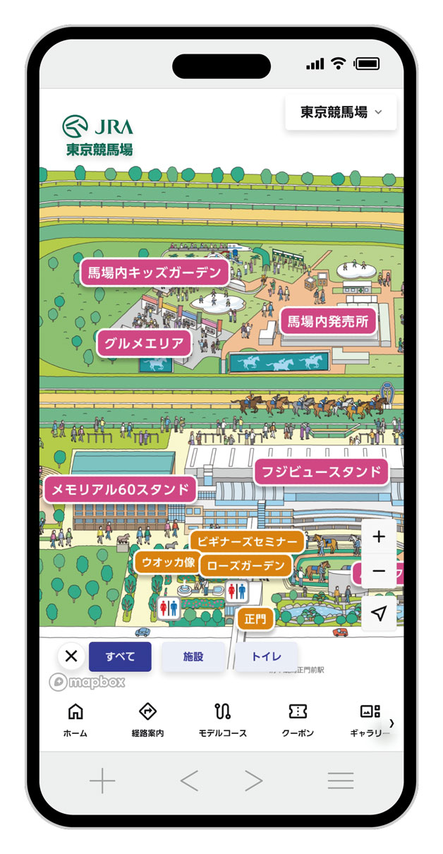 「東京競馬場マップ」がオンラインで登場!見逃せないスポットの紹介やおすすめの過ごし方、全メニューが掲載された飲食店情報に加え、お得なクーポンもございます。これ一つで初めての方も東京競馬場を存分にお楽しみいただけます。ぜひご利用ください。