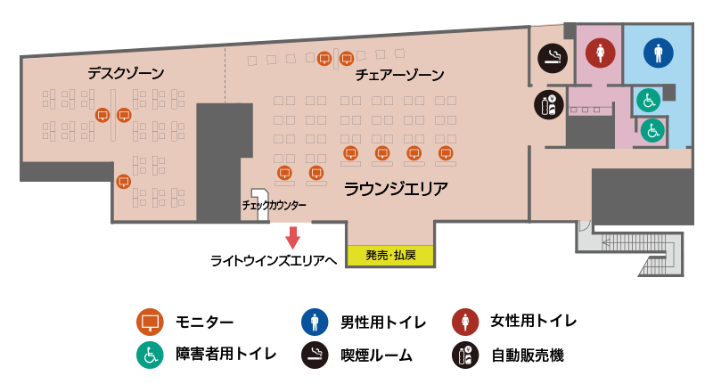 - ・ラウンジエリアにおいては、他のお客様のご迷惑とならない範囲でお食事をお楽しみください。ただし、ライトウインズエリアでのご飲食は禁止とさせていただきます。
