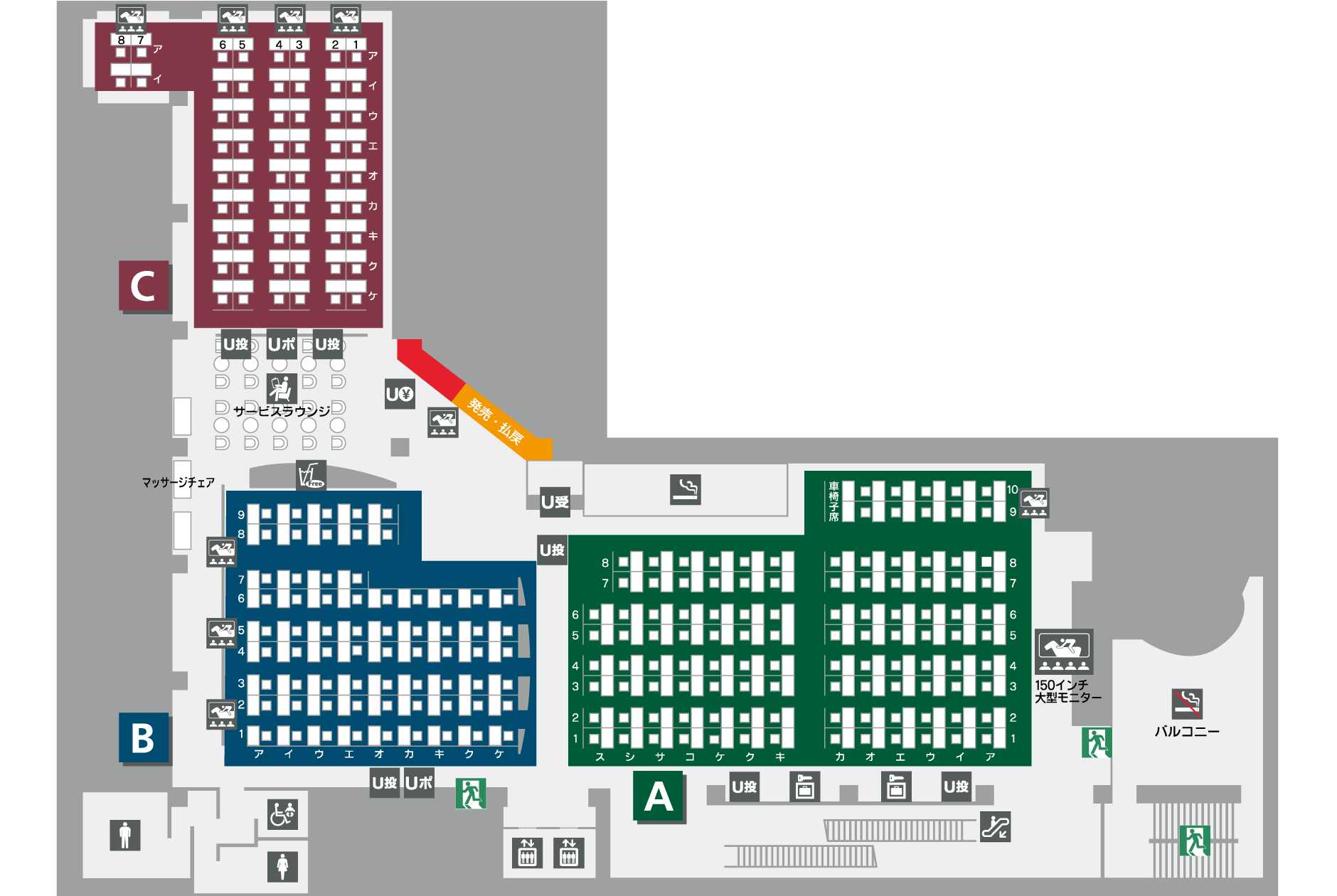 150インチ大型モニター1台・65インチモニター7台・42インチモニター5台/UMAポート2台/インフォメーション/サービスラウンジ(マッサージチェア2台/雑誌閲覧コーナー/ソファ2脚)/売店/コインロッカー60個(ご利用時に100円硬貨の投入が必要ですが、利用終了時に返却されます)/全席コンセント完備 |