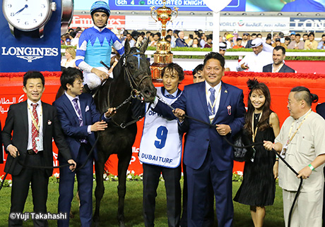 ドバイターフの表彰式で喜びの表情を見せる関係者